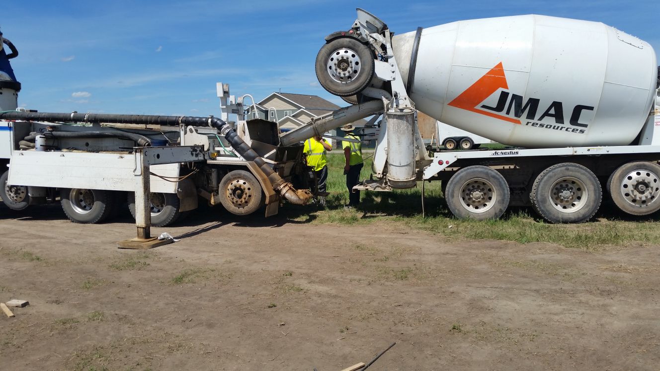 Second truck getting ready to dump concrete into pour truck.