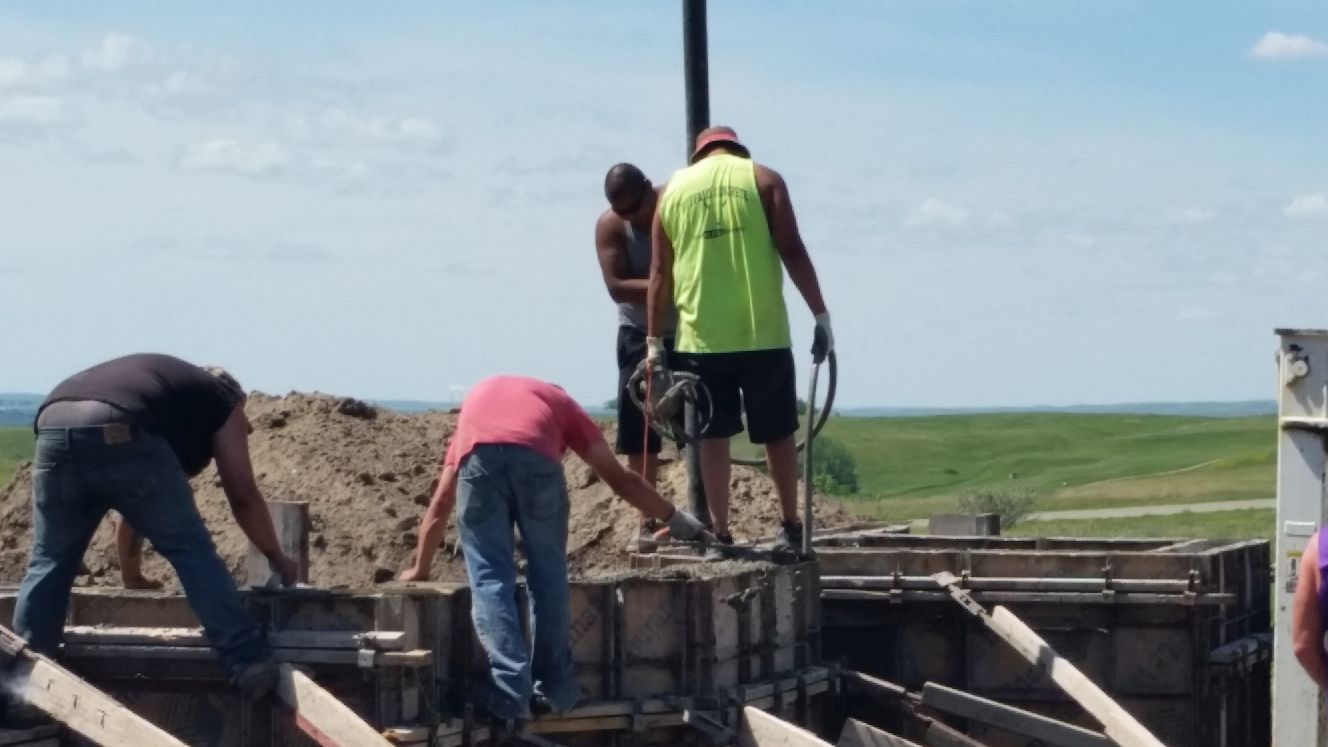 One person vibrates (hand held equipment with hose) the concrete to help it settle