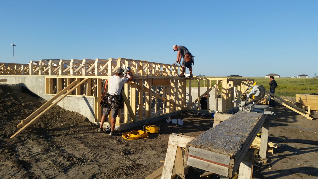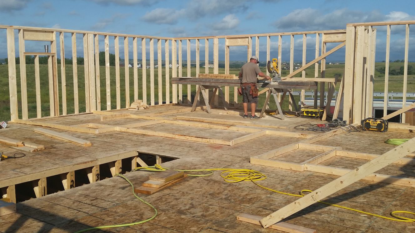 Sheets of plywood are placed on the floor trusses. Wood 2x4's for the main floor