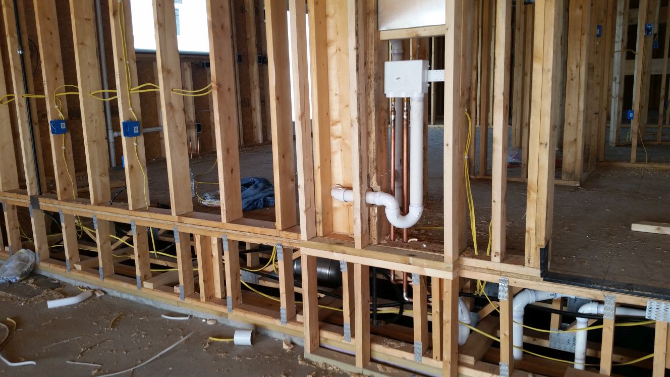 The plumbing distributes water to the faucets, toilets, washing machine, and dish washer.