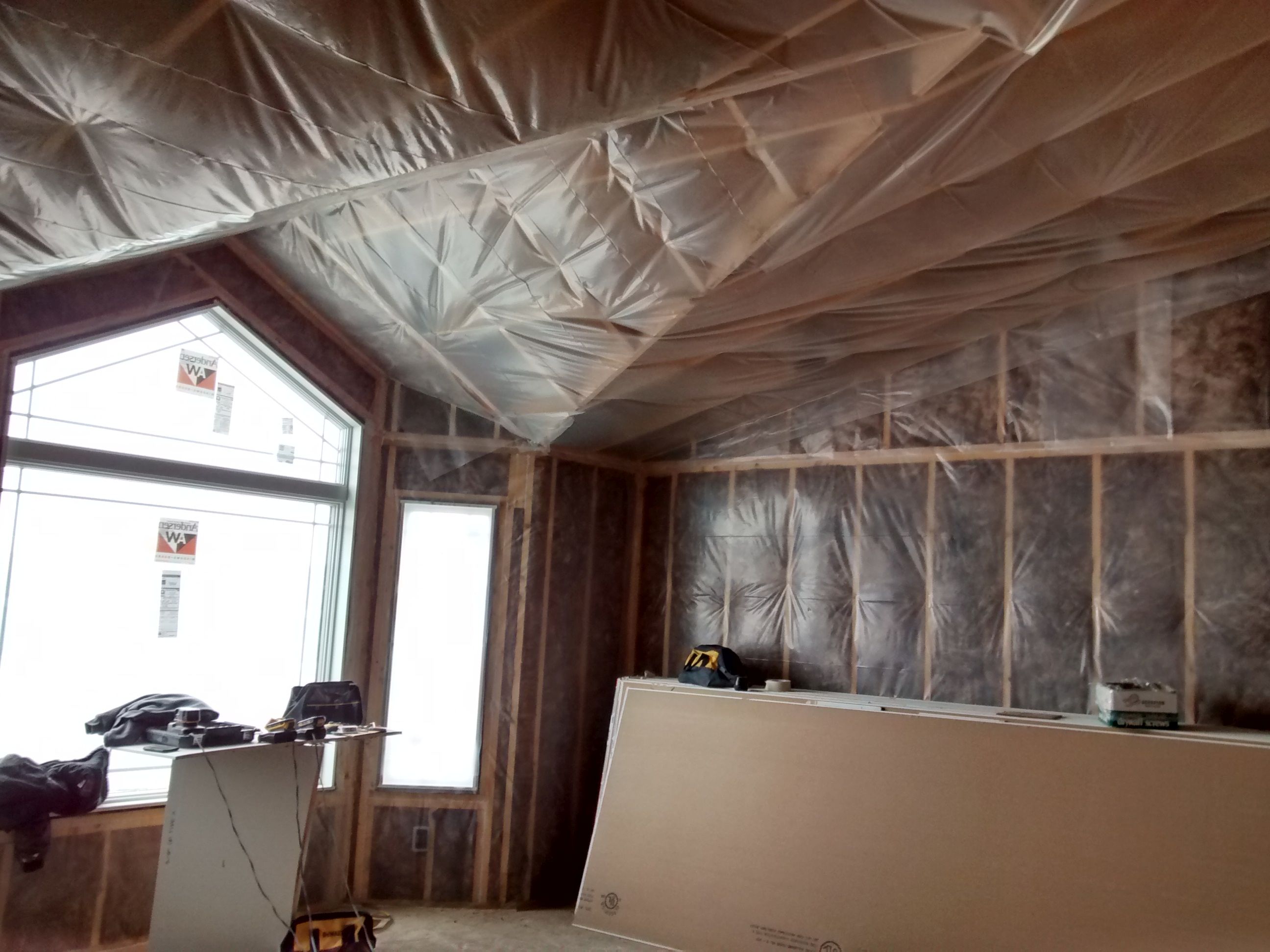 Plastic covers the walls and ceiling to keep moisture away from the insulation. Wet insulation