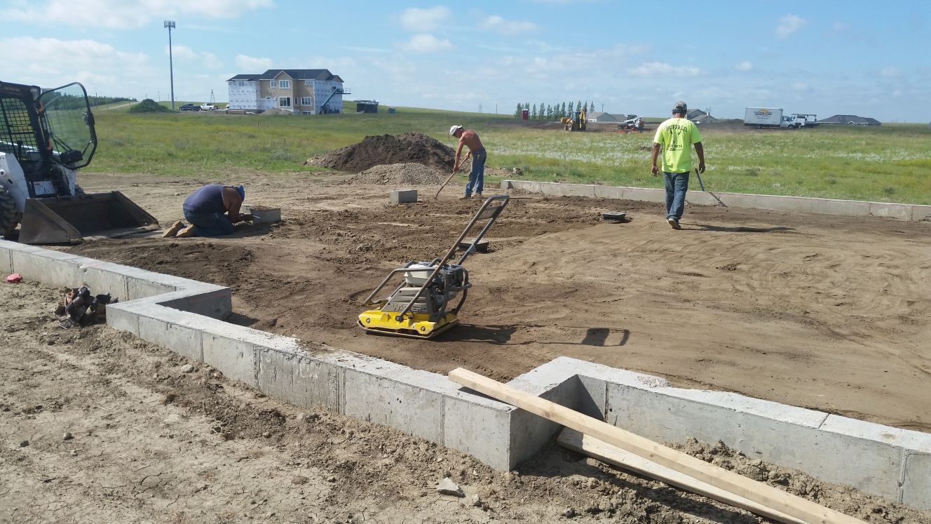 Before the concrete garage floor is poured, the ground is smoothed and packed (yellow).