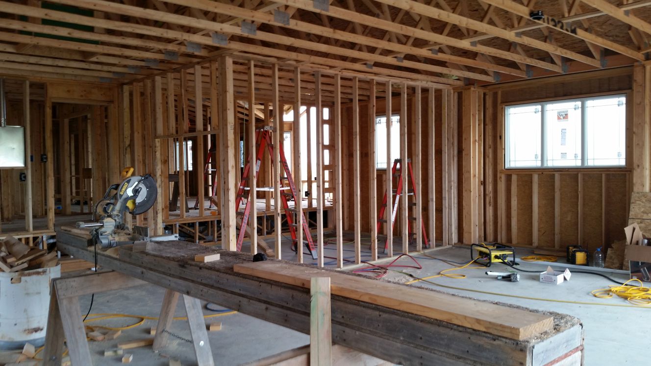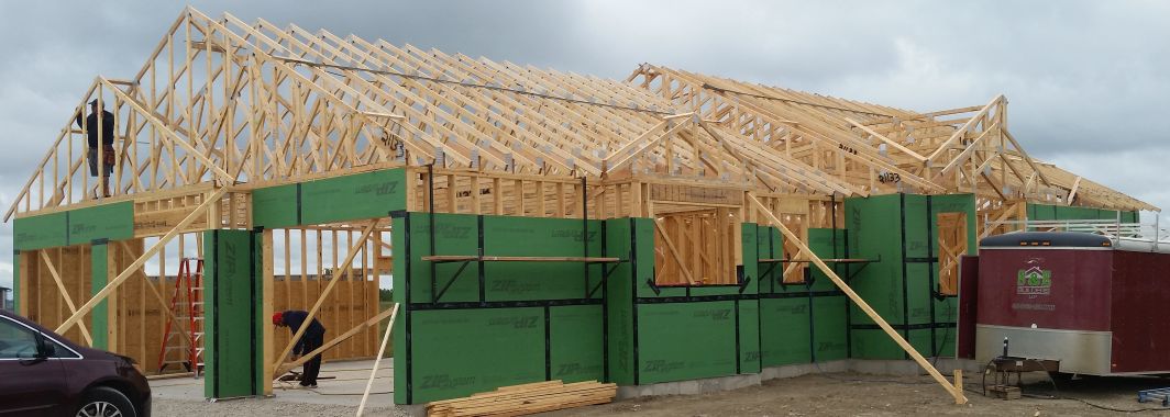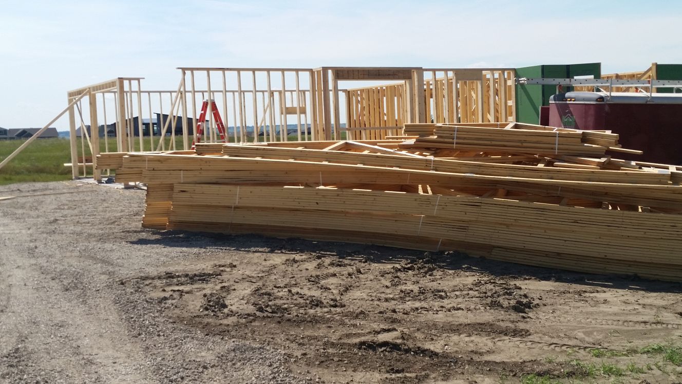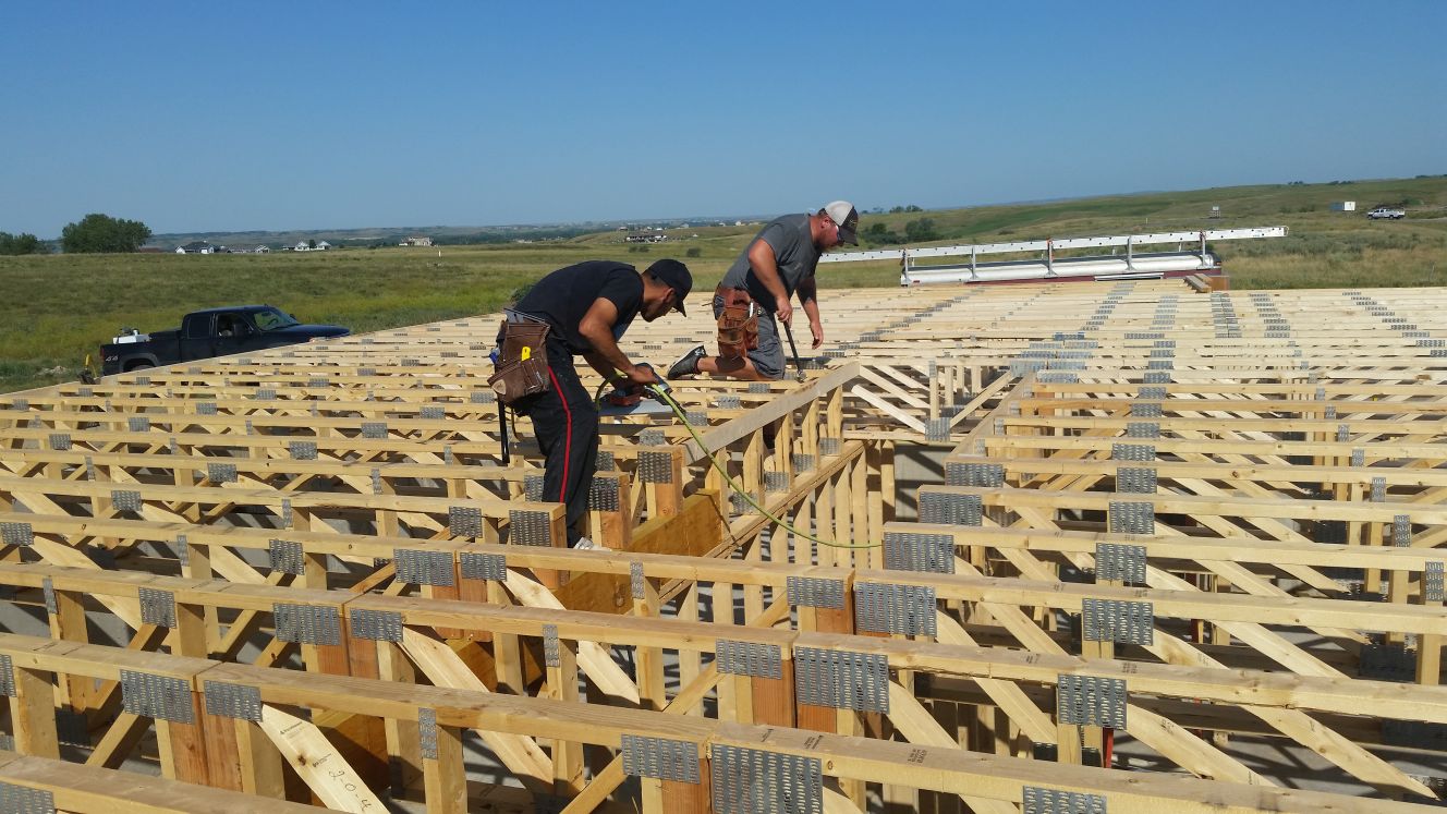 Sheets of plywood are placed on the floor trusses. Wood 2x4's for the main floor