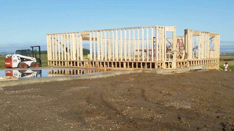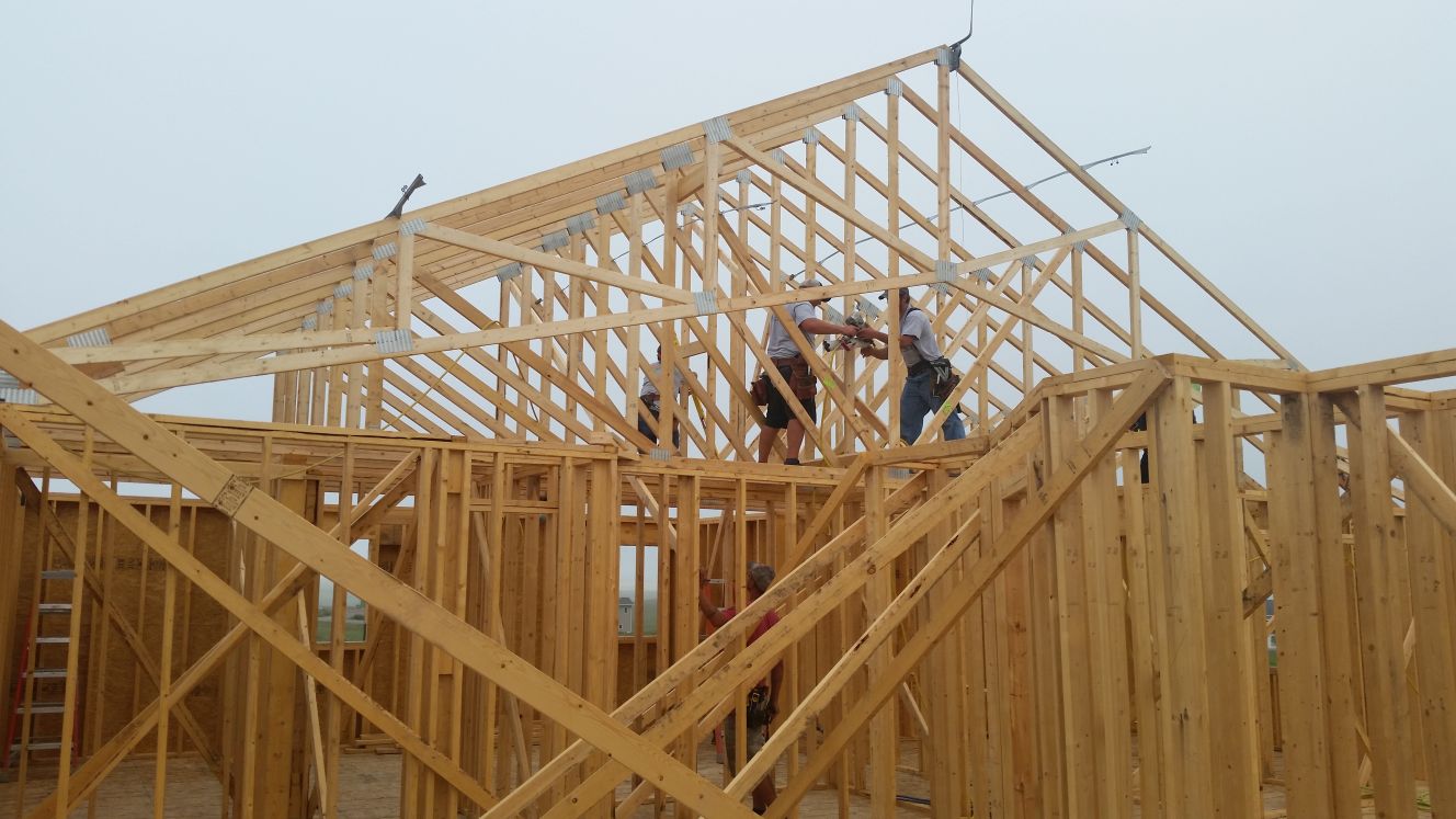 The garage walls are being added. On the ground, in front of the house, are the roof