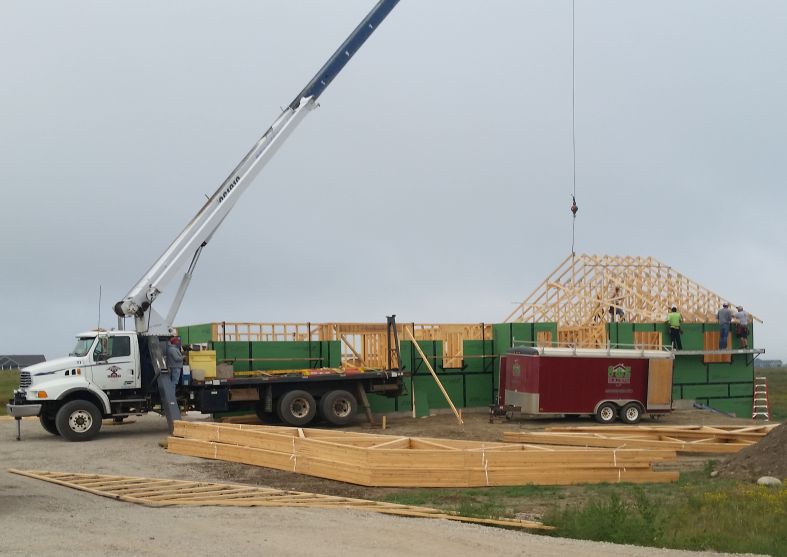 Roof trusses lifted to top of house with a crane.