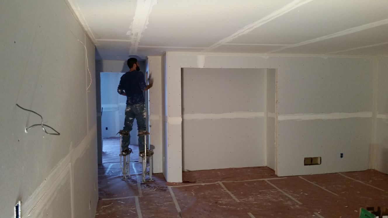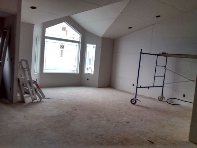 The drywall (also known as sheetrock), 4 foot by 12 foot, is stacked against the walls before being attached to the walls.