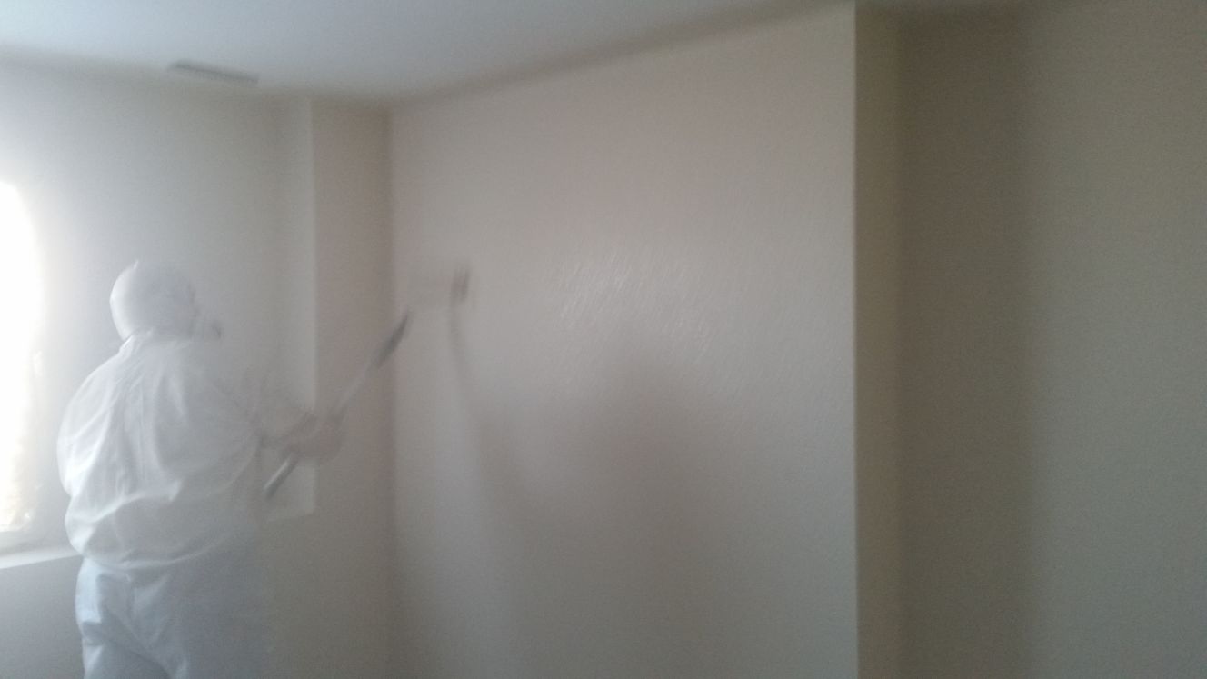 Texture is sprayed on the walls to add interesting patterns to the wall surrace. Then paint